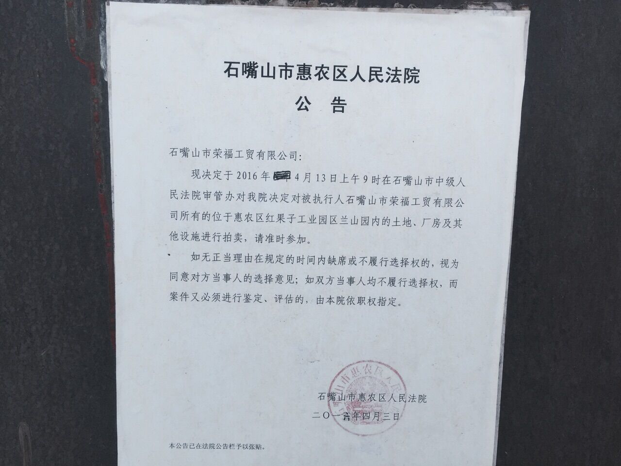 受石嘴山市惠農(nóng)區(qū)人民法院的委托,本公司定于2016年5月19日(星期四)15時舉行拍賣會對位于惠農(nóng)區(qū)紅果子鎮(zhèn)蘭山園內(nèi)的土地及地上建筑物、院內(nèi)設備進行公開拍賣。